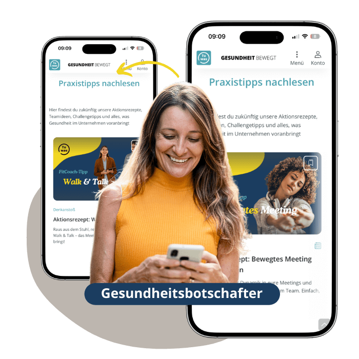 Challenges mit dem Team, Wochenaufgaben umsetzen, Gesundheitskompetenz verbessern, persönliche Ziele erreichen. Aktive Pause starten.